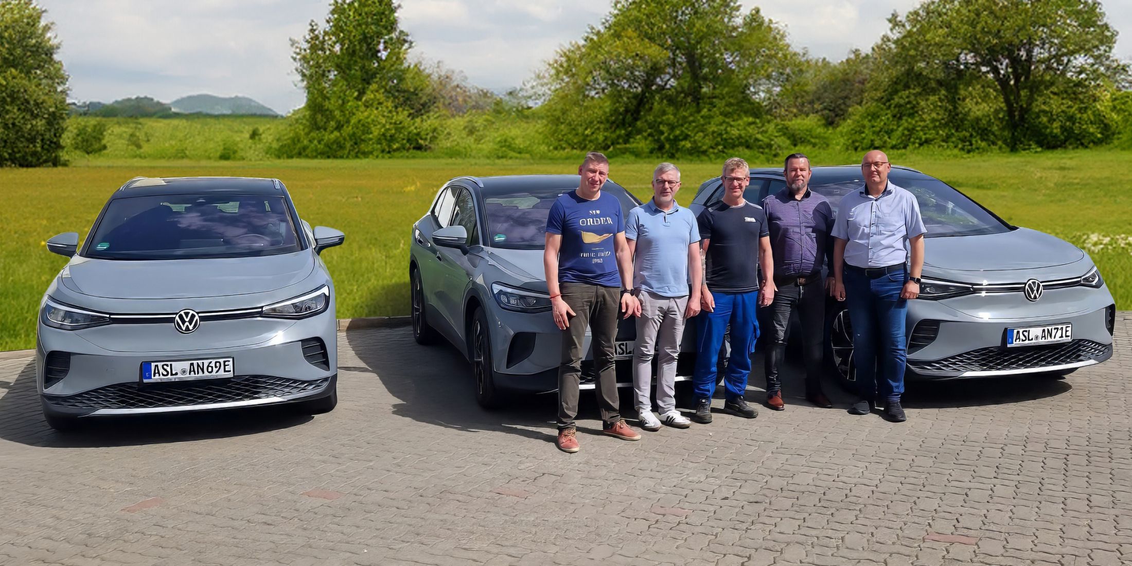 Ab sofort sind unsere Mitarbeiter Thomas Klopstein (Leiter Energiedatenmanagement 1.v.l.), Hardy Pries (Netzmeister Gas/Trinkwasser, 2.v.l.) und Olaf Thiele (Leiter Kundenabrechnungsservice, 5.v.l.) mit ihren neuen E-Autos in Aschersleben und Umland unterwegs.